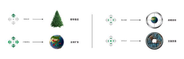 LOGO不僅在造型上發(fā)生變化,還對(duì)其內(nèi)涵以及企業(yè)價(jià)值進(jìn)行升華注入了四個(gè)概念。并且通過(guò)視覺(jué)符號(hào)進(jìn)行表現(xiàn)。分別是:代表精專(zhuān)穩(wěn)定的松樹(shù)、向全球擴(kuò)張業(yè)務(wù)的箭頭、表達(dá)戰(zhàn)略目標(biāo)的準(zhǔn)星、以及和行業(yè)屬性相關(guān)的錢(qián)幣造型。