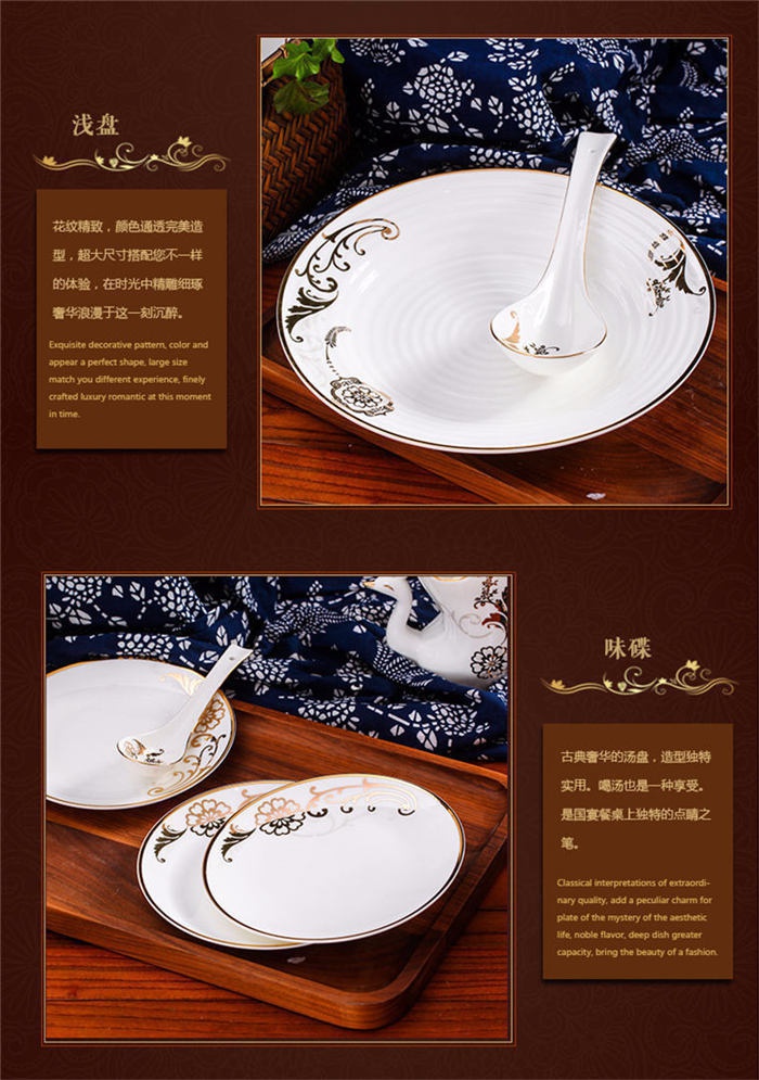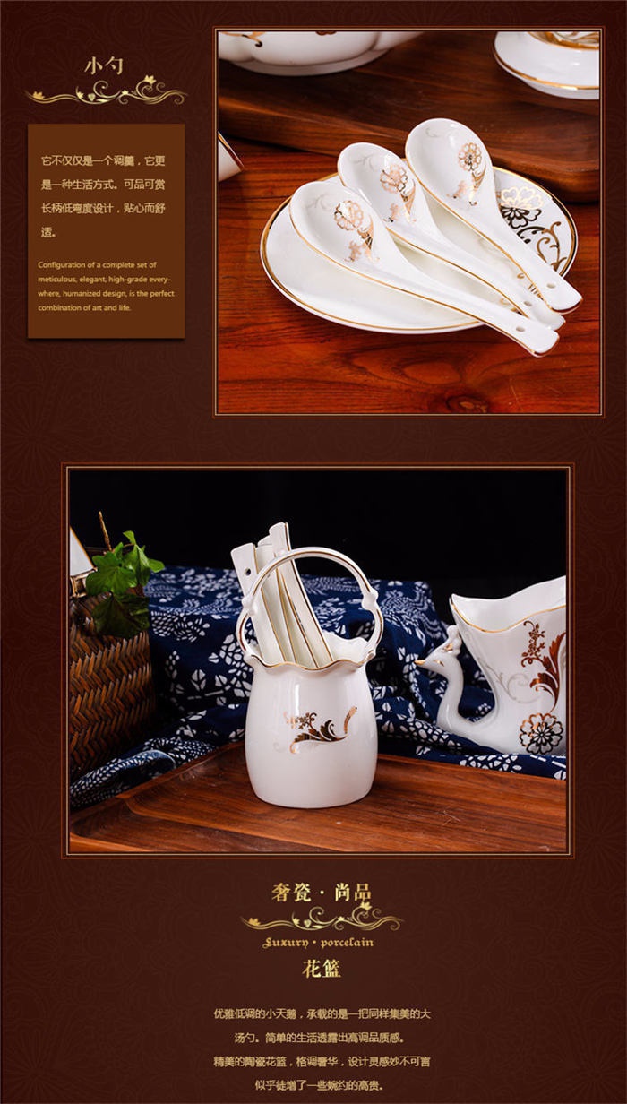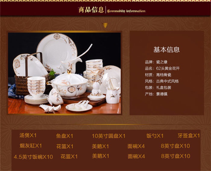62頭黃金花開,一個湯煲,一個魚盤,一個十寸圓盤,一個飯勺,一個牙簽筒,一個煙灰缸,一個花籃,一個美鵝,四個面碗,十個八寸盤,十個4.5寸飯碗,十個五寸骨碟,十個調羹,十個筷子架。