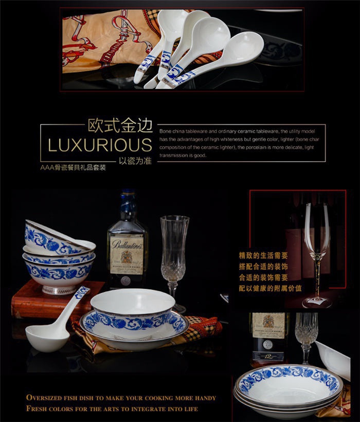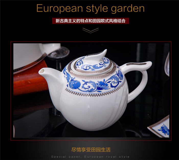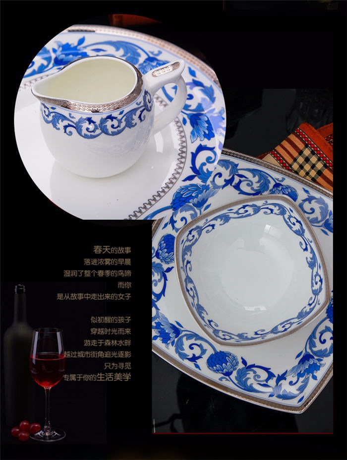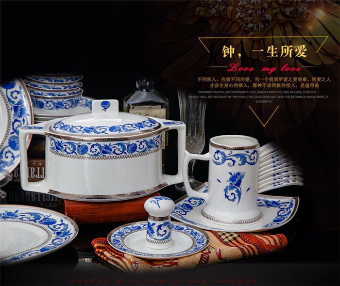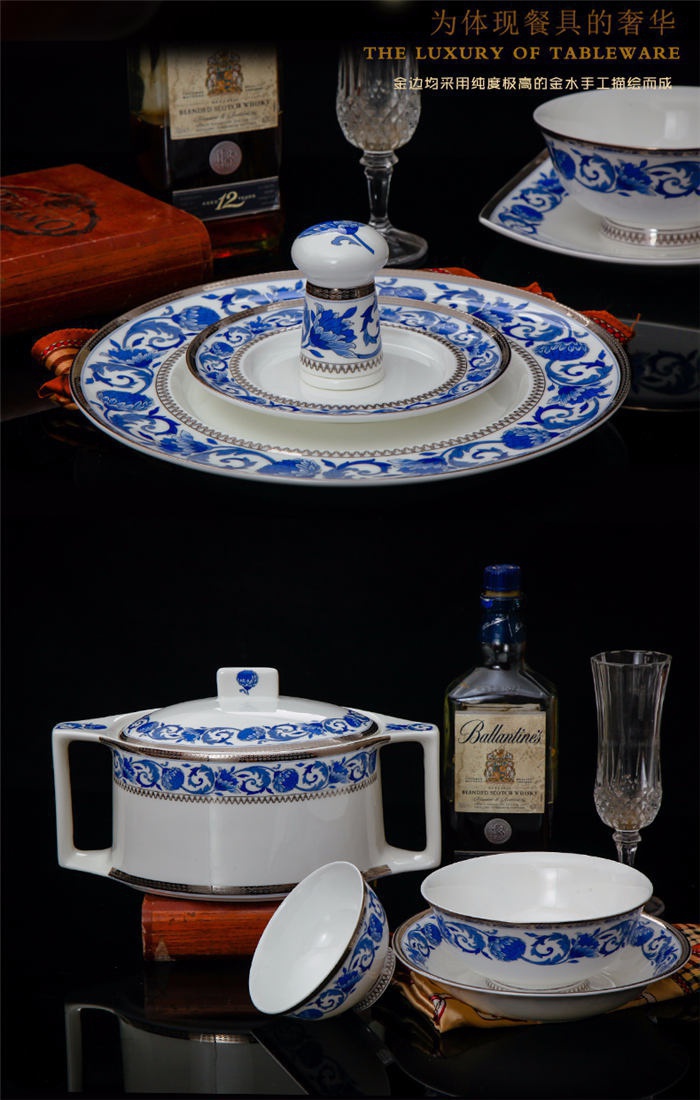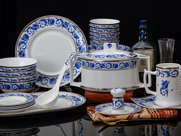 60頭德蘭城堡,一個湯煲,一個魚盤,一個十四寸圓盤,一個湯勺,一個牙簽筒,一個筷子筒,四個面碗,兩個沙拉碟,十個4.5寸飯碗,十個味碟,十個調羹,四個八寸圓盤,四個八寸方盤,十個筷子架。