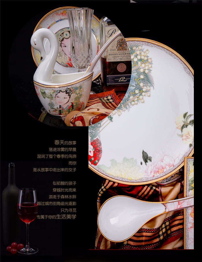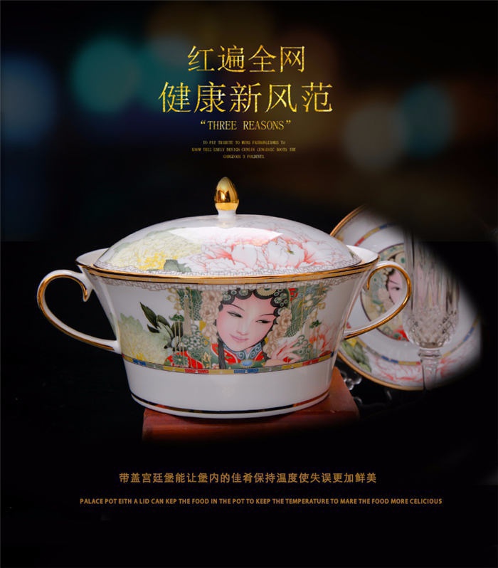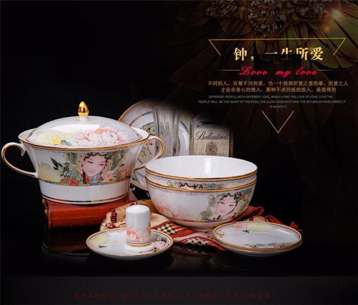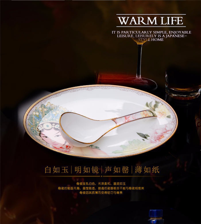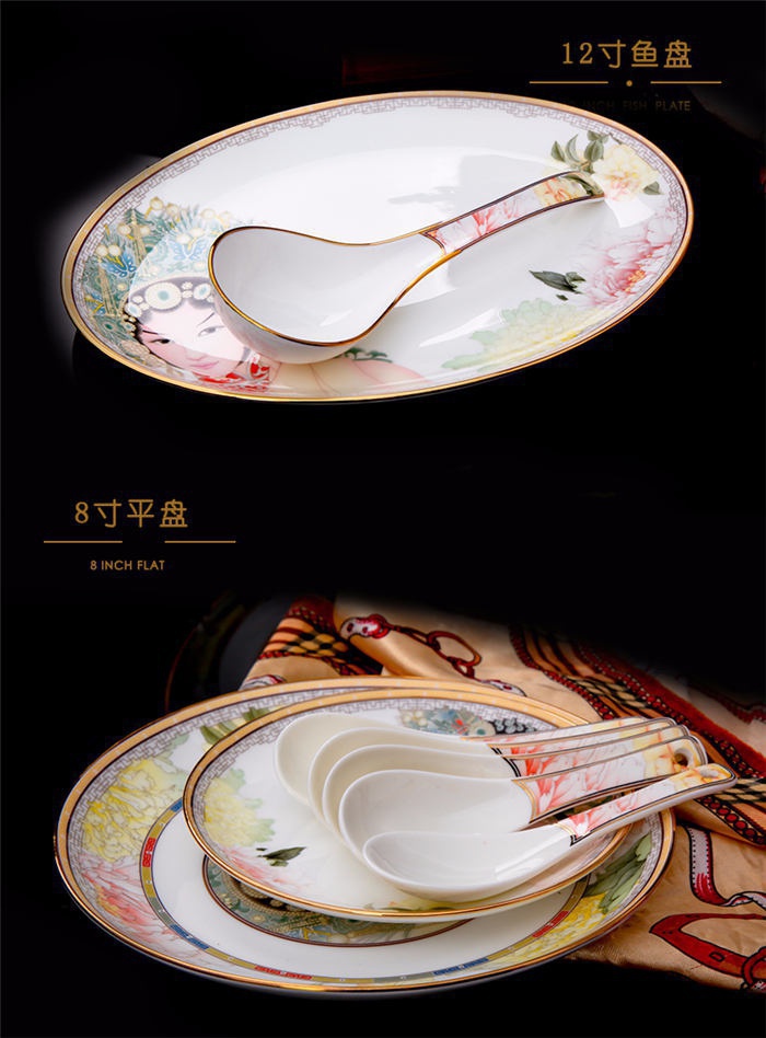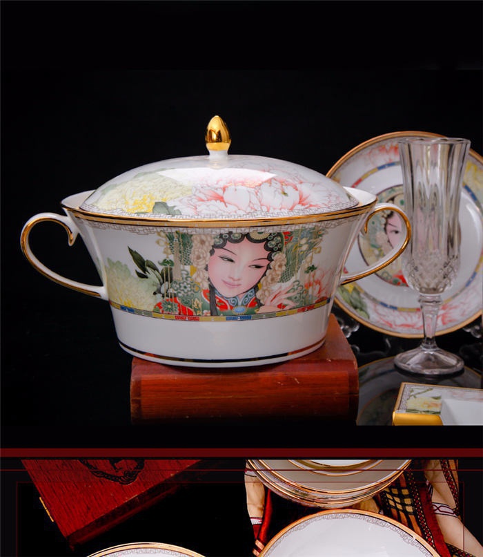 60頭臉譜,一個湯煲,一個飯勺,一個魚盤,一個十寸平盤,一個牙簽筒,一個煙灰缸,兩個面碗,兩個大湯碗,一個花籃,一個鳥,八塊八寸盤,十個4.5寸飯碗,十個骨碟,十個調羹,十個筷子架。